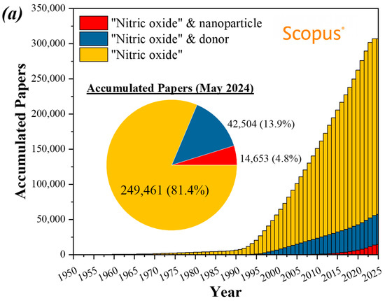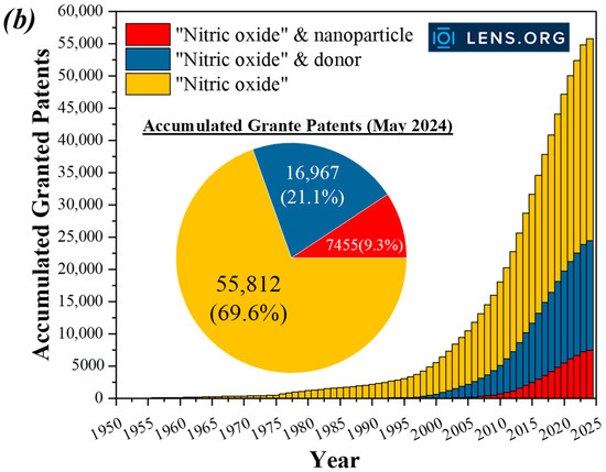 Accumulated (a) published papers and (b) granted patents over the years using “nitric oxide”, “donors”, and “nanoparticles” in the Scopus and Lens.org databases.