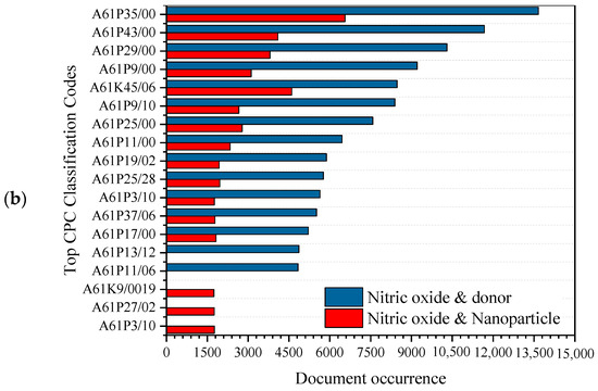 Another apparent trend evidenced by Figure 5a is that most of the top owners besides universities are related to medical applications. This relation is further established by organizing the patents by the top Cooperative Patent Classification (CPC) codes, as shown in Figure 5b. These codes are an extension of the IPC and help to find regulatory trends. As can be seen, all top 15 codes begin with A61P, with A being “human necessities”, 61 referring to “medical or veterinary science hygiene”, and P denoting “specific therapeutic activity of chemical compounds or medicinal preparations”, showcasing the important role of such materials in modern medicine. In addition, the most prevalent code used in the patents is A61P35/00-Antineoplastic agents, showcasing a vital role in fighting cancer, a multi-trillion-dollar market [101].