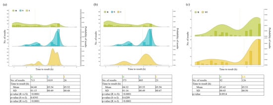 Times to MIC results by Vitek Reveal AST assay for all organisms (a), Enterobacterales only (b) and Pseudomonas aeruginosa only (c) from positive blood culture samples. Times (range: 3 to 8 h) were stratified according to the S/I/R groups of organisms and presented using histograms with Kernel density plots. Differences between groups (in terms of means ± standard deviation) were assessed for statistical significance. The probability of MIC results falling in the indicated range was calculated by fixing the total area under the curve of each density plot equal to 1.