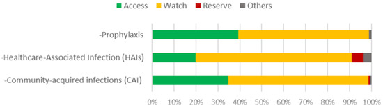 For antibiotic prescribing by AWaRe group, the predominant indication in all types was the watch group, 63.9% for CAIs (n = 234), 71.1% for HAIs (n = 143) and 39.5% (n = 103) for prophylaxis, whereas the reserve group corresponded to 4.9% (n = 10) for HAIs, as shown in Figure 1.