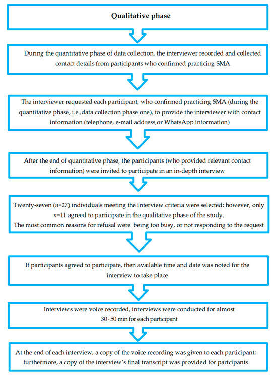 The current study was conducted in two phases. Participants for the second phase (qualitative) were chosen from those who took part in the first phase (quantitative) [27]. In the quantitative phase, interviewers asked participants who admitted to practicing SMA (n = 72) to share their contact information, such as phone numbers, email addresses, or WhatsApp details. This allowed researchers to follow up with them for the second phase of the study. Of the n = 72 participants, n = 27 provided their contact information and agreed to participate in semi-structured interviews for the qualitative phase. Thus, only those participants who consented to the qualitative study were included in the final analysis. This purposive sampling method helped ensure that participants in the qualitative phase had relevant experience with SMA, supporting the study’s objectives. After the first phase ended, n = 27 participants were invited to participate in the qualitative phase; however, only n = 11 agreed to participate. Semi-structured interviews were then conducted with these 11 participants (Figure 1). Upon agreement, the preferred times and dates for the interviews were recorded. The study carefully documented the number and key characteristics of participants, which were essential to the research. The participant pool included individuals from diverse demographics, such as age, gender, highest level of educational attainment, and occupation, to ensure a well-rounded exploration of the topic. Participant engagement throughout the research process was closely monitored, including their active involvement during interviews. However, participants did not have a direct role in data analysis or reporting, which helped maintain transparency and the overall thoroughness of the study [63]. The sample size was determined by reaching saturation, the point at which no new information was being gathered [64]. The in-depth interviews were conducted in a convenient and quiet public place in Kuala Lumpur, with the duration ranging between 30–50 min, where no other person was present except the researcher and the participant. Each interview was voice recorded, and notes were also taken during the interview when necessary. At the end of each interview, a copy of the voice recording was given to each participant; furthermore, a copy of the interview’s final written transcript was provided for the participants. The hallmarks of the data collection process are shown in Figure 1.