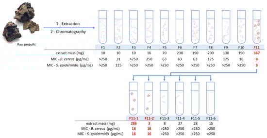Briefly, 9.0 g of propolis OFAP18 was extracted with ethanol (water–ethanol (30:70, v/v) leading to an ethanol extract which was concentrated under vacuum to a crude powder (1.8 g) and subsequently submitted for flash chromatography (from non-polar to polar namely petroleum ether, ethyl acetate, and methanol) yielding 73 fractions of 20 mL which were grouped into 11 fractions titled F1 to F11