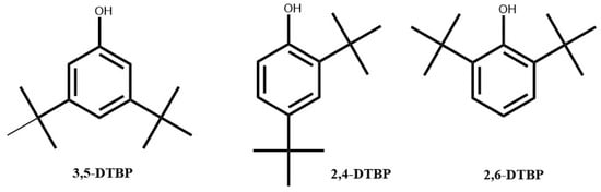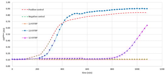 Bacillus cereus ATCC 11778 were determined to evaluate the dynamics of their antibacterial activity. No inhibition of bacterial growth was observed in the presence of 2,6-DTBP at a concentration of 16 µg/mL. In contrast, the growth response to 2,5-DTBP was more nuanced; inhibition was observed during the first 13 h, followed by a subsequent escape from the action of the compound. Finally, significant growth inhibition was only observed with the 2,4-DTBP isomer used at a 16 µg/mL concentration (