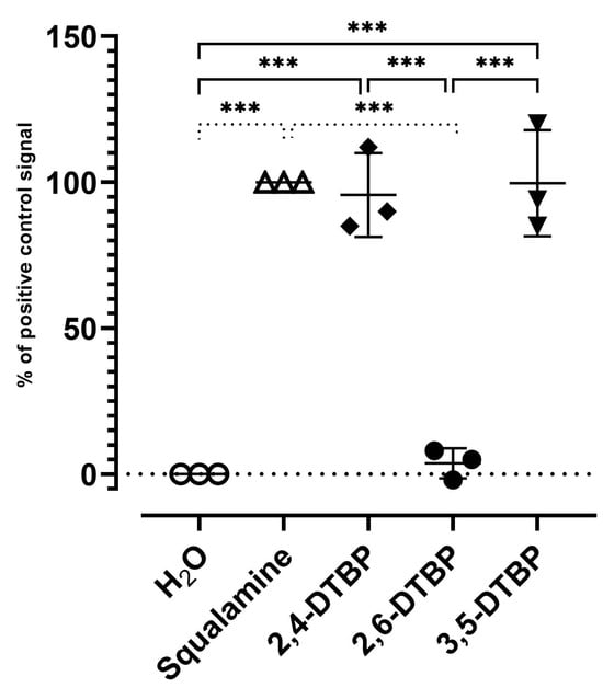 Figure 5). Nevertheless, we must keep in mind that the concentration used for these compounds was very high, whereas only 2,4-DTBP was active at around 16 µg/mL, suggesting that LPS damage induced by this latter is clearly greater and faster than that caused by 2,6-DTBP. Conversely, no significant effect was found by using water as a negative control as well as 2,6-DTBP during the test time, with only a 0 and 10% ATP efflux release relative to the squalamine positive control, respectively.