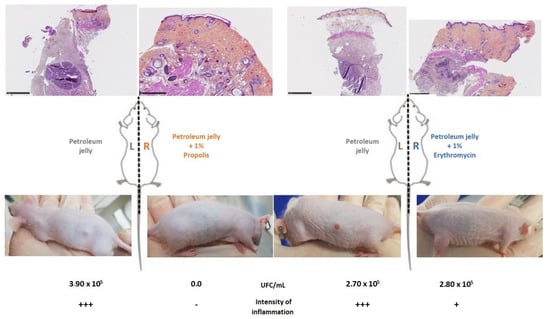The propolis OFAP18-based ointment (1%) was prepared by mixing 95 g petroleum jelly (Cooper, cooperation pharmaceutique française, Paris, France) and 5 mL of a glycerol solution containing 1 g of pure extract of OFAP 18. Thus, petroleum jelly was added gradually, and the contents were mixed for 10 min until obtaining a homogeneous ointment. The ointment was then stored in a sterile tube at 4 °C. A similar protocol was followed to prepare a 1% erythromycin ointment by dissolving 1 g of erythromycin in 4 g of glycerol, then mixing it with 95 g of petroleum jelly. The sterility of the different ointments was then verified by suspending them in sterile distilled water and depositing 100 µL of these suspensions on TSA agar plates and incubating them at 37 °C for 24 h.
