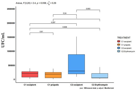 Therefore, due to significant variations in the number of bacteria counted within the mouse categories, we did not achieve statistically significant results regarding the reduction in the bacterial population. However, the comparison between pimples treated with OFAP18 (cohort 1) and those treated with petroleum jelly alone (cohort 2, without propolis diffusion) reveals a significant decrease in C. acnes concentration.