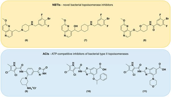 Structural representations of the investigated novel bacterial topoisomerase inhibitors (6 (N-(4-bromo-3,5-difluorobenzyl)-1-(2-(6-methoxy-1,5-naphthyridin-4-yl)ethyl)piperidin-4-amine), 7 (2-(4-((4-bromo-3,5-difluorobenzyl)amino)cyclohexyl)-1-(6-methoxy-1,5-naphthyridin-4-yl)ethan-1-ol), and 8 (4-bromo-3,5-difluoro-N-(6-(((6-methoxy-1,5-naphthyridin-4-yl)oxy)methyl)tetrahydro-2H-pyran-3-yl)benzamide)) and ATP-competitive inhibitors of bacterial type II topoisomerases (9 (1-(2-(3,4-dichloro-5-methyl-1H-pyrrole-2-carboxamido)-5-(5-oxo-4,5-dihydro-1,3,4-oxadiazol-2-yl)phenyl)piperidin-3-aminium chloride), 10 (2-(3,4-dichloro-5-methyl-1H-pyrrole-2-carboxamido)-4-(1-phenylethoxy)benzo[d]thiazole-6-carboxylic acid), and 11 (2-(3,4-dichloro-5-methyl-1H-pyrrole-2-carboxamido)-4-morpholinobenzo[d]thiazole-6-carboxylic acid)).
