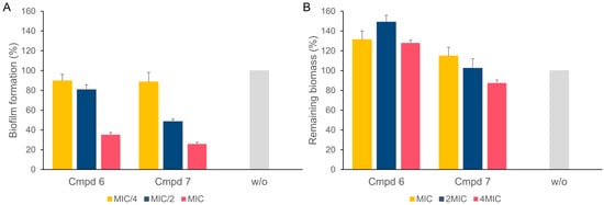 Inhibition of A. baumannii biofilm formation (A) and mature (24 h old) A. baumannii biofilm disintegration (B) with compounds 6 and 7 at different concentrations. Treatment with DMSO (w/o (without the compound), grey) was used as negative control.
