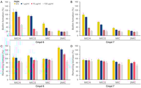 Inhibition of biofilm formation (A,B) and biofilm disintegration (C,D) with compounds 6 and 7 at concentrations equal to MIC/4, MIC/2, MIC, and 2MIC (MIC1 = 0.125 µg/mL; MIC2 = 1 µg/mL), alone (w/o), and with increasing concentrations of PAβN (1 µg/mL, 10 µg/mL, and 100 µg/mL).