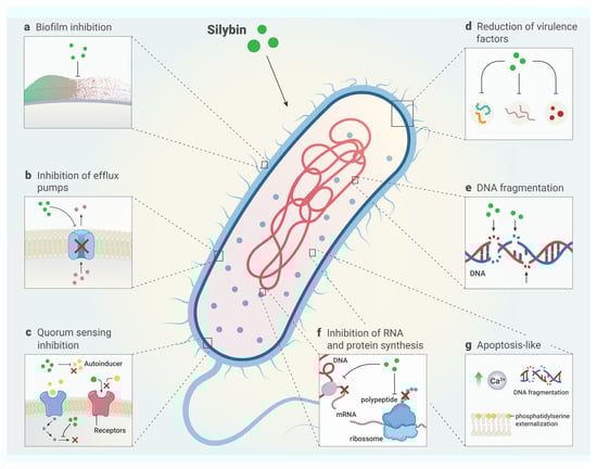 Antibacterial mechanism of silybin. Silybin exerts its antibacterial action through different mechanisms, including (a) inhibition of biofilm formation and biofilm formation, disrupting adherent bacterial communities; (b) inhibition of the expression of efflux pump genes, such as NorA, ABC and AcrABZ-TolC pumps, increasing the intracellular concentration of silybin; (c) inhibition of quorum sensing, limiting bacterial communication; (d) reduction of virulence factors, such as adhesins that are essential for the cell adhesion process; (e) DNA fragmentation, resulting in damage to the genetic material; (f) inhibition of RNA and protein synthesis; and (g) apoptosis-like death, promoting DNA fragmentation and cell death.