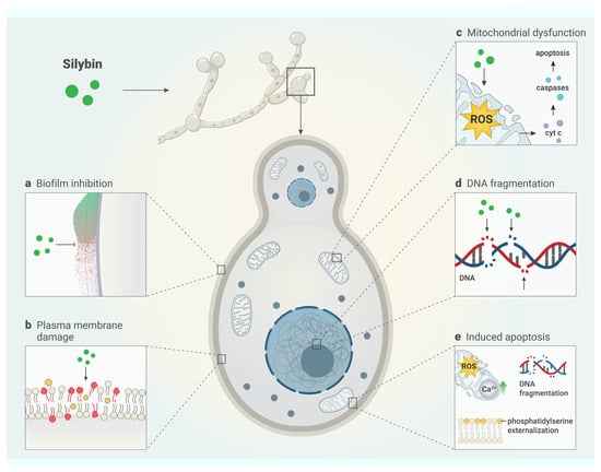 The main mechanisms of silybin’s antifungal actions, including the inhibition of biofilm formation and induction of apoptosis, have not yet been well elucidated and explained in the scientific literature [11,47]. Recent studies describe different mechanisms by which silybin inhibits C. albicans, including from mitochondrial changes to plasma membrane damage. These are shown in Table 5.