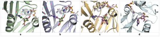 Molecular docking validation—superposition of predicted poses (pink) of co-crystallized inhibitors on initial conformations (green): (a) trimethoprim in saDHFR binding site (PDB ID: 2w9s, RMSD 0.6535 Å); (b) trimethoprim in ecDHFR binding site (PDB ID: 7mym, RMSD 0.3521 Å); (c) UCP11E in caDHFR binding site (PDB ID: 4hoe, RMSD 0.4389 Å); (d) trimethoprim in hDHFR binding site (PDB ID: 2w3a, RMSD 0.9559 Å).