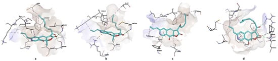 The physicochemical properties predicted for the studied ligands (Table 2 and Table 3) show similarities in terms of the number of acceptor and donor hydrogen bonds as well as the number of violations of Lipinski’s Rule of Five (without violation of this rule for the studied ligands). The octanol–water partition coefficient (WlogP) values for the studied ligands are also close, ranging from 3.51 to 4.41.
