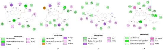 Regarding the docking mode in the selected microbial situs, it occurs primarily through van der Waals interactions (Figure 4b). Here as well, due to the pronounced toxicity (Table 3 and Table 4, Figure 5) also anticipated by previous in silico studies [35,36,37,38], it is recommended that fractions containing red polyketides be incorporated into topical formulations.