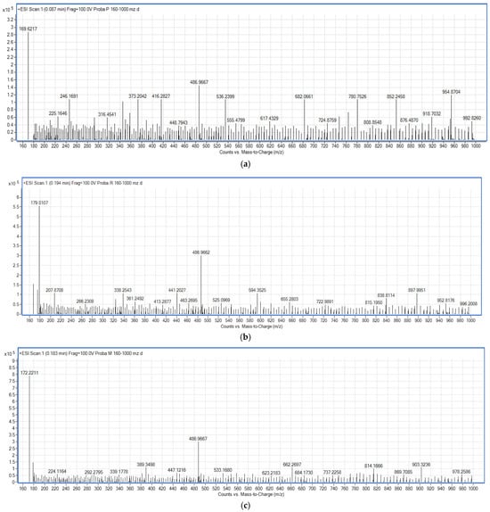 The qualitative analysis of the data obtained from the ESI-MS analysis allowed for the assignment of only a limited number of compounds (Figure 6a–c and Table 5). In the extract obtained from the bioproduct resulting from M. purpureus, all the studied compounds were highlighted. On the other hand, the extract obtained from M. ruber does not contain Ankaflavine and Monascorubrine. In the extract obtained from the highly productive M. ruber, the compound Ankaflavin appears, but the compound Monascorubrine is still absent. A relatively high content of Monascorubramine was found in the extract obtained from the bioproduct derived from the highly productive M. ruber strain.