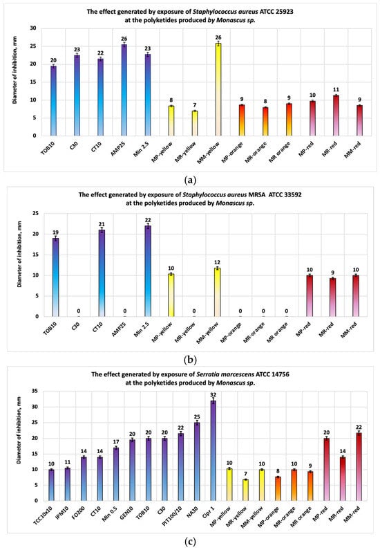Regarding Gram-negative bacteria, the largest inhibition diameters for all studied cases (S. enterica, P. aeruginosa, S. marcescens) were obtained from the extracts containing red polyketides (Figure 7c–e) biosynthesized by highly productive M. ruber (MM-red) and M. purpuresus (MP-red).
