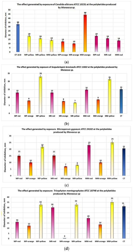 In the case of S. marcescens, these extracts demonstrated a significant antimicrobial effect, with the best results obtained from the bioproducts MM-red (inhibition diameter = 22 mm) and MP-red (inhibition diameter = 20 mm). The experimental studies conducted on fungi (Figure 8a–d) showed that for C. albicans, the fraction containing orange polyketides synthesized by highly productive Monascus ruber exhibited distinctly significant antimicrobial activity, with an average inhibition diameter of 44 mm—a value superior to all standardized antibiotics used for comparison. In descending order of the average inhibition diameters are the bioproducts MP-red and MP-yellow (inhibition diameter = 19 mm), followed by MR-red and MR-yellow (inhibition diameter = 16 mm) and MM-red and MM-yellow (inhibition diameter = 14 mm) (Figure 8a).