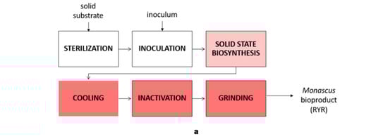 - In vitro studies regarding the activity of bioproducts containing yellow, orange, and red pigments obtained by biosynthesis on a solid substrate with three strains of Monascus. The studies in vitro were conducted on pathogenic microorganisms, including G+ bacteria, G− bacteria, and fungi. The experimental study design is illustrated in Figure 1.