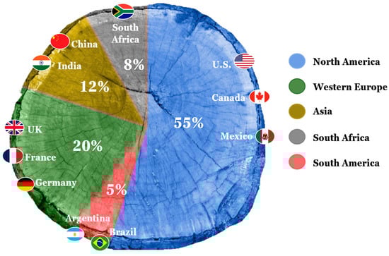 Percentage of global natural cinnamaldehyde market, regional distribution, and expected reach in 2023. North America is the region that leads the TCA industry, followed by Europe and Asia. Adapted from Insights (2023).