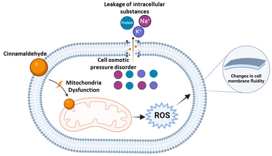 Schematic representation showing the potential inhibition mechanism of trans-cinnamaldehyde. TCA changes the cell membrane’s permeability and attacks the mitochondria, leading to the reactive oxygen species (ROS) and leakage of intracellular substances such as Na+, K+, and proteins. Adapted from [10,20,21]. Created in Biorender.