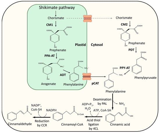 Proposed cinnamaldehyde biosynthetic pathway in microalgae. Black dotted lines show multiple enzymatic steps involved. Black arrows represent enzymatic, or transport steps supported by direct experimental evidence. Gray dashed arrows represent hypothesized steps. Enzyme abbreviations: CM, chorismate mutase; PPA-AT, prephenate aminotransferase; ADT, arogenate dehydratase; pCAT, plastidial cationic amino acid transporter; PDT, prephenate dehydratase; PPY-AT, phenylpyruvate aminotransferase; PAL, phenylalanine ammonia-lyase 4CL, 4-coumarate-CoA ligase; CCR, cinnamoyl CoA reductase. Adapted from [48,49,50,51,52]). Created in ChemDraw.