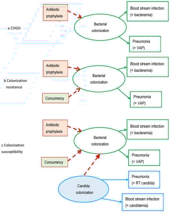 Structural equation modelling (SEM) is a suite of multivariable statistical techniques which offers an alternative approach to addressing these research questions []. SEM enables causal relationships within structural models to be tested by confrontation against data. Hence, in considering SEM as an alternative approach, we need to consider the three competing hypotheses of the relationship between exposure of the microbiome to antimicrobial prophylaxis and the risk of blood stream infection (Figure 1), being colonization resistance and its counterpart, colonization susceptibility, and a third concept of antimicrobial action directly controlling gut overgrowth (COGO) [,,,,,,,,].