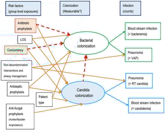- Hurley, J.C. Structural equation modeling the “control of gut overgrowth” in the prevention of ICU-acquired Gram-negative infection. Crit. Care 2020, 24, 189. [Google Scholar] [CrossRef]