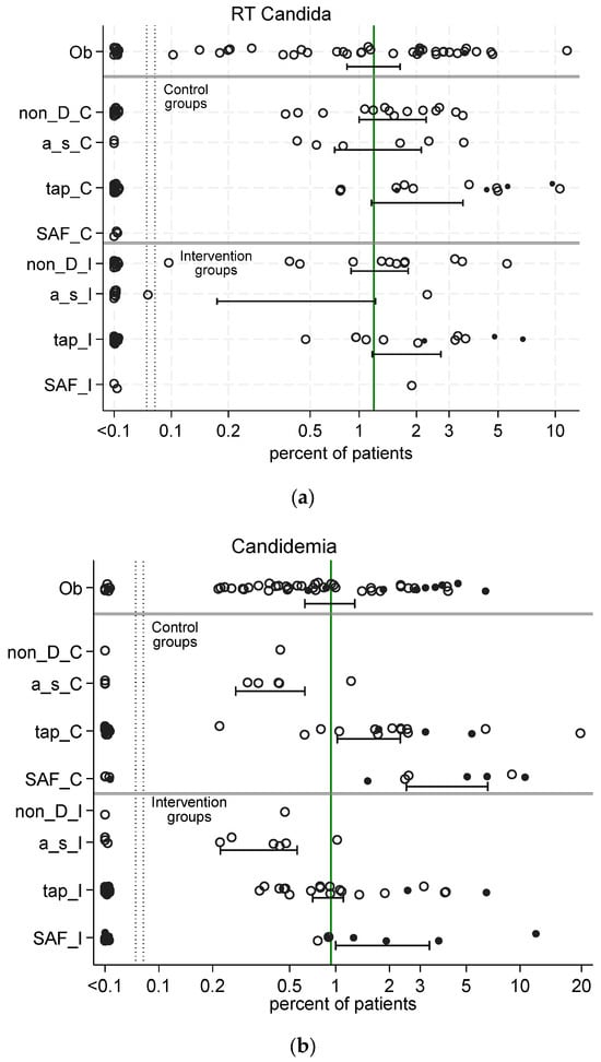 Scatter plots (logit scale) and 95% CI of respiratory tract (RT) Candida incidence (a) and candidemia (b) in component (control and intervention) groups of studies of various methods of infection prevention and observational studies in the ICU. Data from 289 studies as listed in reference []. The mean proportion (and 95% CI) derived by random-effect meta-analysis for each category of component (observational [Ob], control [_C], and intervention [_I]) group derived from observational [Ob], non-decontamination (non-D), antiseptic (a_s), topical antibiotic prophylaxis (tap), and single antifungal (SAF) studies, is displayed. The benchmark incidence in each plot is the summary mean derived from the observation studies (central vertical line). The group-wide presence of candidemia risk factors (CRF) is identified by solid symbols versus not (open). The data in the figure are listed in reference [].
