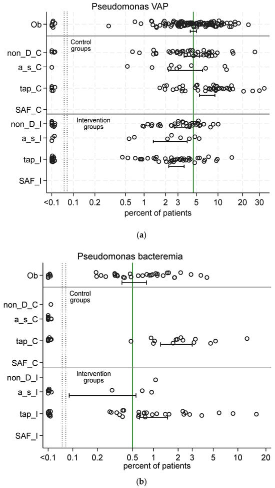 Scatter plots (logit scale) and 95% CI of Pseudomonas VAP incidence (a) and Pseudomonas bacteremia (b) in component (control and intervention) groups of various methods of infection prevention in the ICU. The benchmark incidence in each plot is the summary mean derived from the observation studies (central vertical line). Abbreviations as for Figure 3. The data in the figure are listed in reference [].
