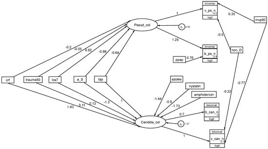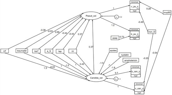 A model of colonization susceptibility as a GSEM. The model is as for Figure 6 but includes an interaction between the latent variables representing Candida and Pseudomonas colonization. The AIC is 3921. The figure is adapted from reference [] and used here under the terms of the Creative Commons Attribution 4.0 International License (http://creativecommons.org/licenses/by/4.0/) (accessed on 12 November 2024).