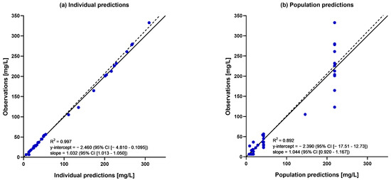 Goodness-of-fit plots illustrating (a) individual predictions and (b) population predictions vs. observed dalbavancin concentrations.