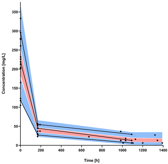 Visual predictive check for the final population pharmacokinetic model. Black dots are the observed dalbavancin concentrations; black lines represent the median, 10th, and 90th percentiles of the observed values; and shaded areas are the prediction intervals for the median (red central area) and 10th and 90th percentiles (light blue lower and upper areas).