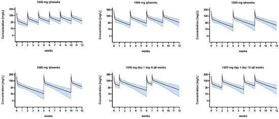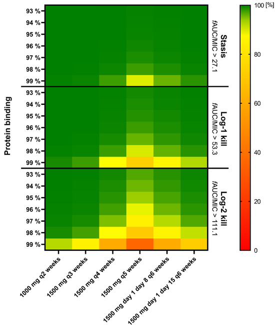 Dosing simulations using the final model developed in this study are shown in Figure 3. These simulations revealed a target attainment ≥ 90% for stasis across all dosing regimens, considering the labeled protein binding of 93% and an epidemiological cut-off (ECOFF) for S. aureus according to EUCAST of 0.125 mg/L. The probabilities of target attainment (PTAs) for stasis are illustrated in Figure 4. Higher protein binding levels as observed in this study expectedly led to substantially lower PTA values. In a scenario of 99% protein binding, the ECOFF was only achieved with a dosing regimen of 1000 mg q2 weeks and 1500 mg q3 weeks (Figure 4).