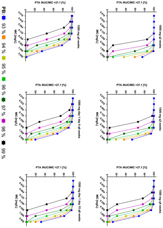 Probability of target attainment (PTA) in % to reach fAUC24 h/MIC > 27.1 for stasis vs. MIC values for different dosing regimens and protein bindings. fAUC: Free area under the concentration curve; MIC: Minimum inhibitory concentration; PB: Protein binding; PTA: Probability of target attainment.