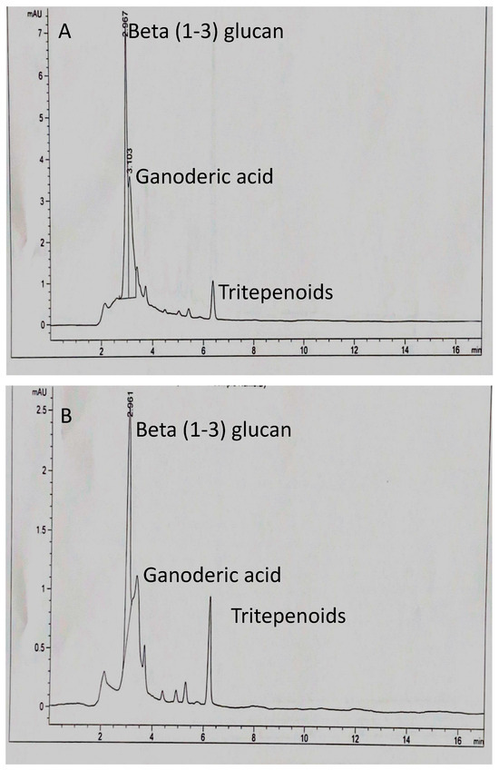 HPLC analysis of aqueous and ethanol extracts of G. lucidum extracts was carried out to identify the bioactive compounds (Figure 2). The results showed qualitative profiles of both extracts of G. lucidum, which were composed of bioactive compounds. In addition, the chromatogram revealed that the aqueous and ethanol extracts showed a sharp peak at a retention time of 2.967 min (Figure 2A) and 1.961 min for ethanol and aqueous, respectively (Figure 2B). Three main bioactive compounds, (beta 1-3) glucans, ganoderic acid, and triterpenoids, were identified in the ethanol (Figure 2A) and aqueous extracts (Figure 2B). Based on the height of the peak, beta (1-3) glucan was the most abundant, followed by ganoderic acid.