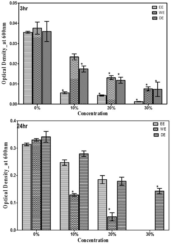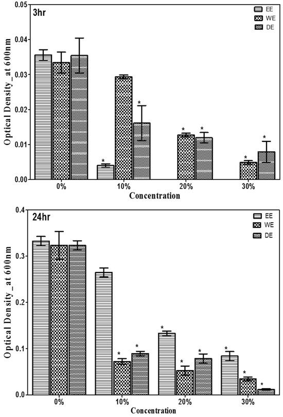 Antimicrobial activity of ethanol, water, and dual solvent extractions of G. lucidum against S. aureus after 3 h and 24 h of incubation. The growth of S. aureus was measured by a spectrophotometer at 600 nm wavelength. EE = ethanol extract; WE = water extract or aqueous extract; DE = dual extract. Asterisk (*) indicates significant difference compared with control (p < 0.05).