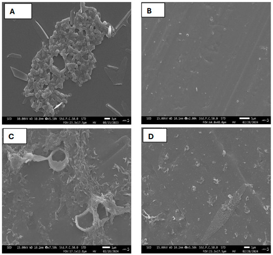 Antimicrobial effects of ethanol extract, aqueous, and dual or double solvent extracts of G. lucidum against E. coli and S. aureus were investigated using the broth microdilution method in sterile 96-well plates (Fisher Scientific, Hampton, NH, USA), which were loaded with 100 µL of each extracted dilution (0–30%) into each well. Bacterial suspensions (10 µL) containing 10 × 103 CFU were added to each well. Furthermore, positive control (without extract) and negative control (no inoculums) were also added to each well. The 96-well plates (Fisher Scientific, Hampton, NH, USA) were incubated at 37 °C, 160 rpm for 24 h. The growth of all the tested microorganisms was assessed by measuring turbidity at 600 nm for hours 0, 3, and 24 h, using a Glomax multi-plate reader (Promega, Madison, WI, USA). Examination of the morphological changes in E. coli and S. aureus treated with 30% of each extract after 24 h was performed using SEM (JEOL JSM-IT800 HL, JEOL Ltd, Akishima, Japan) following the methods described by Ewunkem et al. [22] and Ewunkem et al. [23].