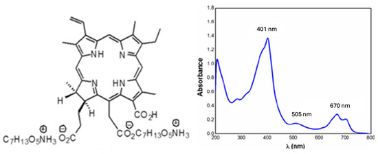 Photodithazine (PDZ) is a chlorine e-6 provided for us by the collaborative efforts of the University of Sao Paulo—Texas A&M University. A stock solution was prepared at 0.5 mg/mL, and from this, the work solutions were prepared using PBS. All the solutions were maintained in the dark at room temperature. The structure and optical absorption of the PDZ used are shown in Figure 6. The photosensitizer was chosen based on the experience of the group [23] and its efficacy in the treatment of Gram-positive and Gram-negative bacteria.