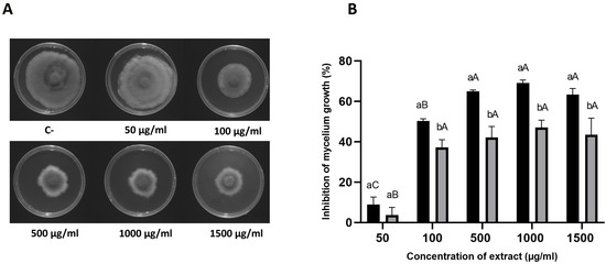 Percentage of growth inhibition of D. corticola by H. helix aqueous extract (HAE). Radial growth of D. corticola mycelium was measured in Petri dishes with PDA medium containing 50, 100, 500, 1000, or 1500 µg/mL of HAE. Representative images of HAE antifungal activity against D. corticola after 6 days of incubation (A). In the negative control (C-), the highest volume of extract used on the assays was replaced by sterilized deionized water (extract solvent). The diameter was measured after 3 (black bars; (B)) and 6 (grey bars; (B)) days of incubation at 25 °C in the dark. Each bar represents the mean ± SD of three independent experiments. A two-way ANOVA was used for the analysis and different letters represent statistical significance. Capital letters were used for comparisons of extract concentrations within the same time of incubation and lowercase letters were used for comparisons of different times of incubation for each concentration tested.