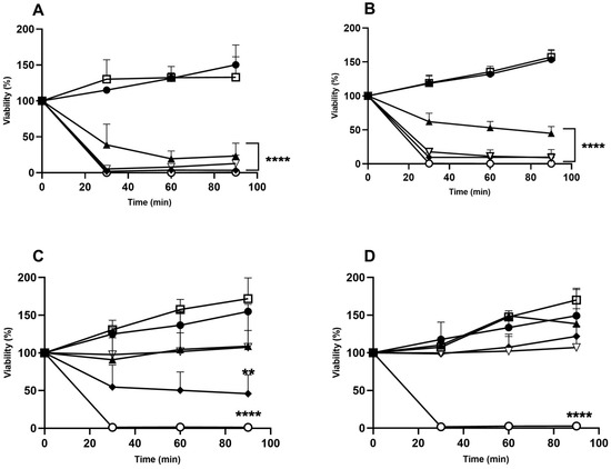 Viability of S. cerevisiae BY4741 (A) and the mutant strains erg2 (B), bck1 (C), and mkk1/mkk2 (D) in the presence of aqueous extract of H. helix (HAE). Cells from exponentially growing cultures were exposed to 10 µg/mL (white squares), 50 µg/mL (black triangles), 75 µg/mL (white inverted triangles), 100 µg/mL (black diamonds), or 250 µg/mL (white circles) of HAE and incubated at 30 °C, 200 rpm. Viability was assessed using CFU after 0, 30, 60, and 90 min of incubation upon spreading 10−4 dilutions on YPDA plates and incubation at 30 °C, 200 rpm. The negative control (black circles) was prepared by replacing the extract by the solvent at the highest volume of extract used in the assays. The data represent the mean ± SD of three independent experiments. A one-way ANOVA and Dunnett’s post hoc test were used for the analysis, and concentrations were compared at each time-point. For clarity of graphical representation, significance is shown only for the 90 min timepoint, where ** means 0.001 < p ≤ 0.01 and **** means p < 0.0001; the absence of significance is not marked with any symbol. Other relevant significances are presented in the text.