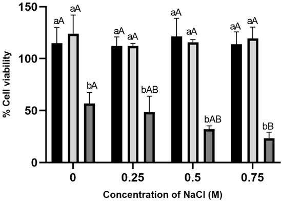 To investigate the hypothesis of the cell wall being a target of HAE, cells from cultures grown in the presence of the extract were tested for osmotic sensitivity. Cell wall-deficient cells are typically osmotically sensitive; therefore, this assay would assess if HAE, in some way, affects cell wall integrity or its ability to protect cells against osmotic stress. Non-exposed and exposed cells to 10 µg/mL of HAE displayed similar viability, regardless of the presence or the concentration of NaCl (p > 0.05; Figure 3). As expected, the activity of 50 µg/mL of HAE is visible in the absence of NaCl, with nearly 50% viability (Figure 2A and Figure 3), but when cells were exposed to increasing salt concentrations, a clear progressive decrease in viability was observed. This effect was more pronounced in 0.75 M of NaCl, in which a significant decrease of viability was observed, suggesting that the toxicity of the extract is aggravated under osmotic stress and might be related with the cell wall. The results were similar for 60 min incubation with HAE.