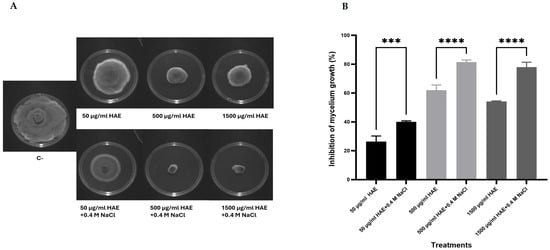 Based on the results of increased osmotic sensitivity in the presence of HAE, the influence of the extract on osmotic sensitivity was also investigated in D. corticola. This approach would allow us to show that HAE might also target the cell wall in this phytopathogen, as was found for the model S. cerevisiae. Radial growth was similar when comparing PDA containing 0.4 M NaCl with PDA plates. A higher concentration, such as 0.8 M of NaCl, affected growth so, 0.4 M was the concentration selected for the experiments. As depicted in Figure 4A,B, the presence of 0.4 M of NaCl increased the growth inhibitory effect of 50 µg/mL of HAE (p ≤ 0.001) and of 500 and 1500 µg/mL of HAE (p ≤ 0.0001). These results are clear indications that, as in S. cerevisiae, HAE affects the integrity of the D. corticola cell wall.