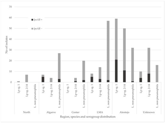 Sample distribution based on lpeAB detection, geographical origin, species, and L. pneumophila serogroups. LMA, Lisbon metropolitan area.