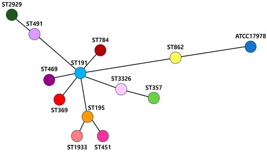 Among the collected isolates, differences were noted between sequence types ST491, ST862, and ST2929, whereas the remaining types showed similar sequences. ST191, the most prevalent sequence type reported in Korean ICUs and wards from 2016 to 2017 [4], was found to be closely related to several other isolates, including ST469, ST369, ST195, ST784, ST491, and ST3326. The newly classified ST3326 was identified as a subgroup of ST191, while ST357 was classified as a subgroup of ST3326.