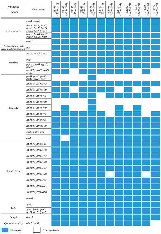 The investigation of virulence factors in all CRAB isolates identified genes associated with acinetobactin, trimeric autotransporters, biofilm formation, capsule production, HemO clusters, lipopolysaccharide, and outer membrane protein A (OmpA). Notably, variations in the biofilm, capsule, HemO cluster, and quorum sensing genes were observed across different A. baumannii sequence types. Details on virulence-associated genes and the results are presented in Figure 3.