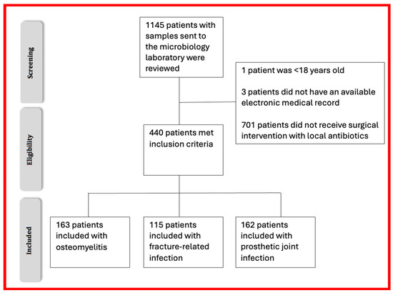 A total of 1145 patients with bone and joint infections were reviewed. Of these, 440 met the inclusion criteria and were included in the study analysis. There were 163 in the osteomyelitis-alone group, 115 with fracture-related infection and 162 in the prosthetic joint infection group. All had implantation of local antimicrobials in a licenced carrier, usually with gentamicin and/or vancomycin (Figure 1).