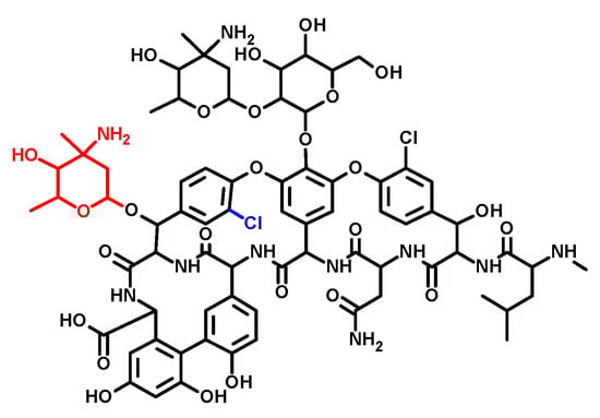 Chemical structure of VCM and ERM glycopeptides. The black formula is the general backbone. The 4-epi-vancosamine (red) is the characteristic substituent in ERM. Additional chlorine (blue) is present in VCM.