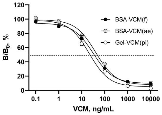 Based on our previous studies on the hapten modification approach [27], it can be assumed that coated VCM structurally related to an immunizing hapten (ERM) is able to selectively interact with antibodies against common structural epitopes from the antiserum against ERM conjugated to glucose oxidase (GO-ERM) and thus switch the selective assay to recognize both analytes. Thus, heterologous VCM-based coating antigens made it possible to quantify VCM in ELISAs using anti-ERM antibodies as the recognition element. We examined three VCM conjugates for plate coating that had provided the highest cross-reactivity of VCM. The optimized antigen/antibody ratios found by the checkerboard titration method allowed the following calibrations to be generated (Figure 2) and the analytical parameters of the assays to be compared (Table 1).