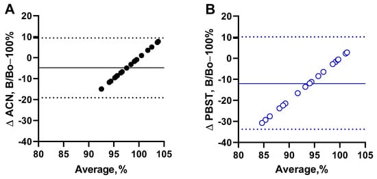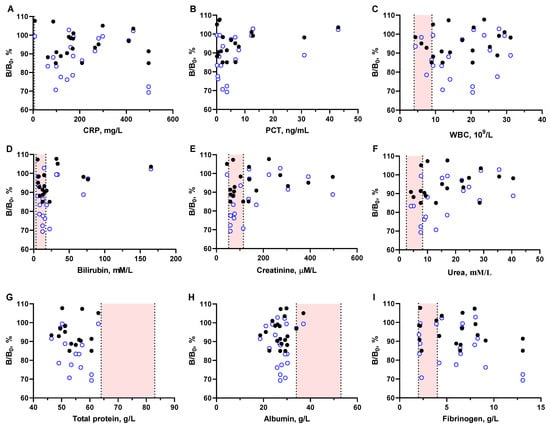 It is noteworthy that such indicators of inflammation as C-reactive protein (CRP), procalcitonin (PCT), and lymphoid cells (WBC) (Figure 3A–C), the biochemical markers bilirubin, creatinine, and urea (Figure 3D–F), as well as protein composition (Figure 3G–I) were significantly different from normal levels (pink range) and varied widely in critically ill patients. Furthermore, the graphs show that changes in these parameters do not correlate with antibody binding levels. Thus, there was no concentration-dependent effect of the considered factors on the output signal of the developed assay. However, compared to simple sample dilution (empty blue circles), there was an evident positive effect of serum deproteinization (black dots), which avoids possible protein-mediated interference. This is more clearly illustrated by the Bland–Altman plots (Figure 4). A comparison of the two pretreatment procedures showed that the ACN-depleted serum samples showed less bias compared to the control (Figure 4A). Due to the reduced matrix effect on antibody binding, such an approach should provide more accurate results.