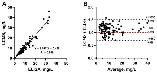 Serum samples from three patients (n = 108) were tested in the developed ELISA and LC-MS/MS to establish the agreement between methods. Both concentration groups were highly correlated (R2 = 0.936) (Figure 5A).